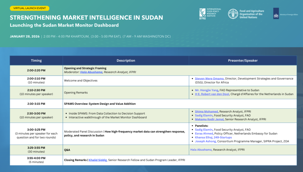 By launching an interactive dashboard (view it here) showcasing SPAMS’ findings overtime, this virtual launch event seeks to bring together humanitarian and development actors, policymakers, and the private sector with the goal to deliberate on the SPAMS’ price and availability data. The goal is to maximize access to essential commodities’ price data across Sudan, to inform evidence-driven dialogue, and promote improved evidence-based decision-making to combat food insecurity amid conflict